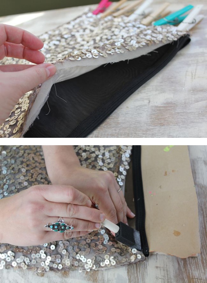 | Đặt miếng bìa cứng vào giữa miếng vải sequin và túi lưới, rồi dùng keo dán mảnh bìa vào túi lưới để cố định cho chiếc clutch cứng cáp hơn. Sau đó dùng bàn chải phủi các miếng sequin bị rơi ra ngoài. |