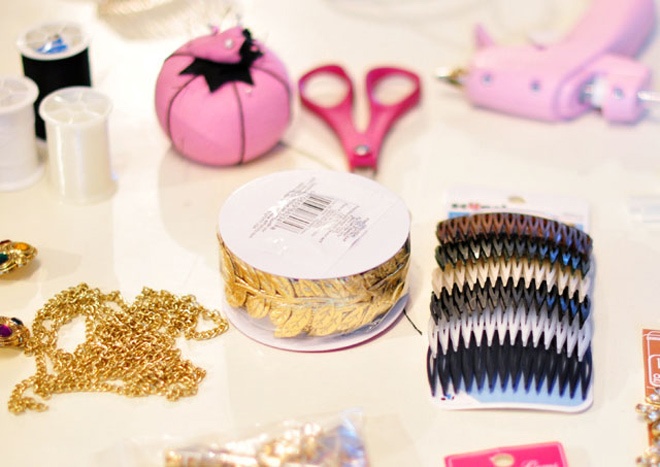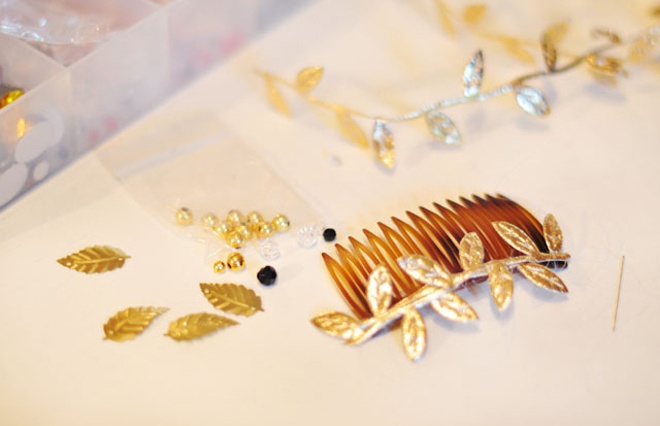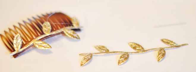 | Trước tiên, bạn cần có một chiếc cài tóc hình lược bằng kim loại hoặc bằng nhựa, một hộp keo dán, kim và chỉ nylon trong suốt bản nhỏ, những sợi dây trang trí hình lá ánh kim, vài chiếc lá rời chất liệu ánh kim, dây chuyền ánh kim sợi nhỏ, vài hạt cườm ánh kim, hoặc giả ngọc trai trắng, hồng hay đen để trang trí thêm. |