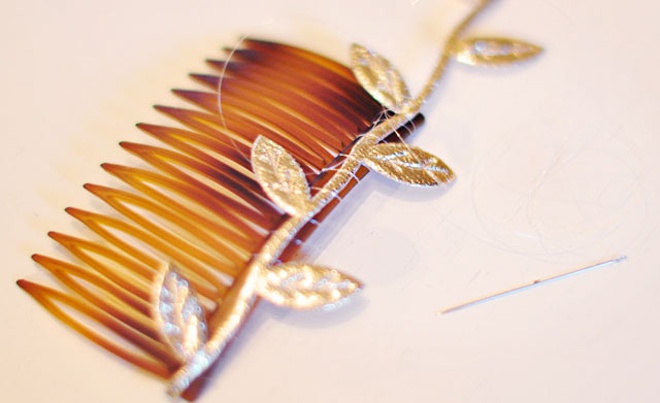| Bắt đầu chế tạo cài tóc ánh kim bằng cách đặt những chiếc lá ánh kim xuôi theo chiều ngang của lược cài tóc, sau đó dùng kim khâu dính dây lá ánh kim vào cài tóc như trong hình minh họa. |