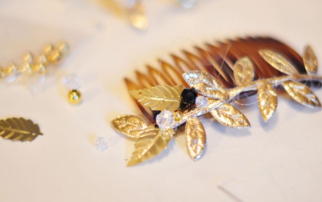 | Để tránh lộ thân lược làm cài tóc mất đi vẻ đẹp tinh tế, bạn nên sử dụng từ 2 đến 3 dây ánh kim, theo hướng các lá kim xếp xen kẽ với nhau. Có thể dùng keo để dán các dây lá ánh kim này lại cho chắc chắn hơn. |
