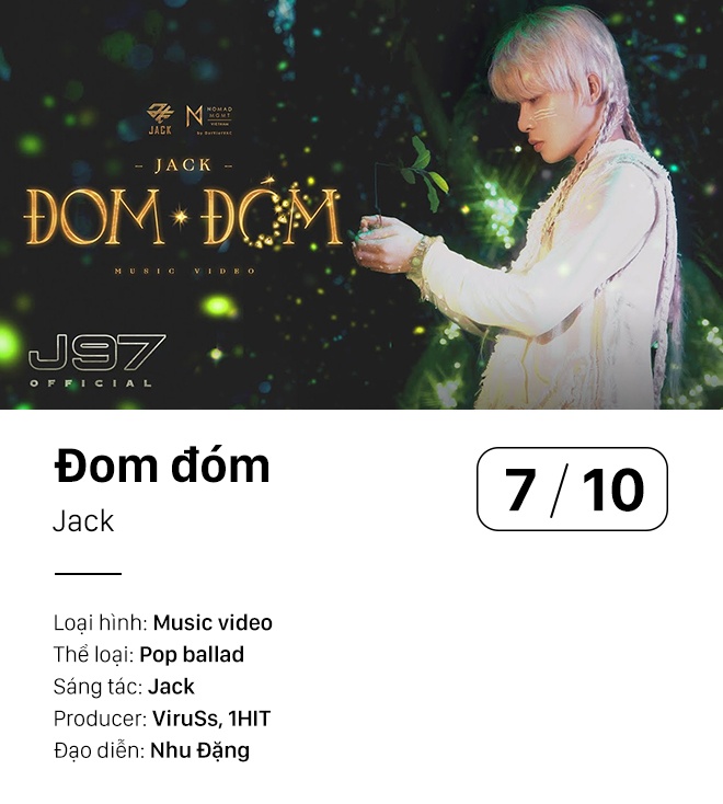 Với mái tóc bạch kim, tết sam ở đuôi, Jack hóa thân thành “thần rừng” trong MV Đom đóm, đăng tải ngày 26/12. Đây là sản phẩm âm nhạc thứ 3 được nam ca sĩ giới thiệu trong năm nay sau Là một thằng con trai và Hoa hải đường.
