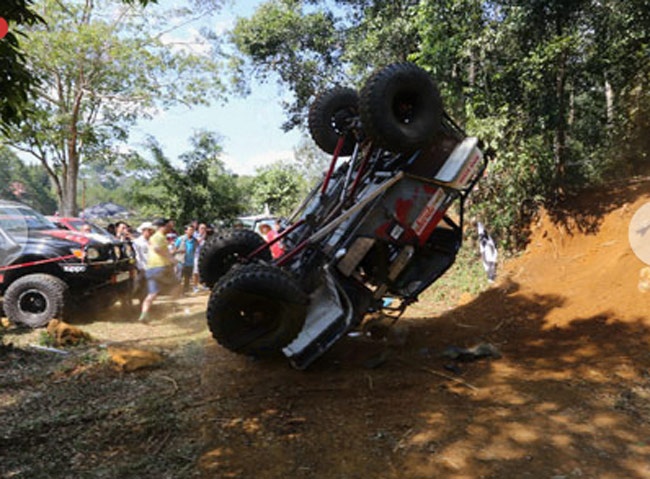 Phía dưới chân đồi, khán giả nghe rõ mồn một tiếng đèn xe, cửa kính vỡ sau mỗi cú va côm cốp vào cây rừng. Hoàn thành bài thi, Quốc nhảy ra khỏi buồng lái nhắc bạn đua cẩn thận vì dốc tức ngược, xe bị trôi tự do. “Tôi kịp đánh tay lái ngang nếu không thì xe ngửa bụng ôm gốc cây rồi”, Quốc cười khi mồ hôi quện với đất đỏ chỉ sau năm phút đua.