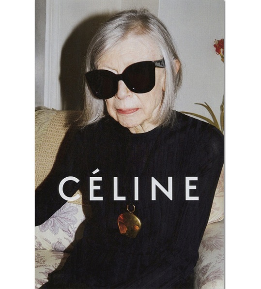 Nhà văn Joan Didion (81 tuổi) trong chiến dịch quảng cáo cho Celine hồi tháng 1. Ông Ewan Shah - đại diện Upfront Models - cho biết: "Ngày càng có nhiều khách hàng muốn quảng bá phong cách sống chứ không đơn thuần là hình ảnh. Họ tìm kiếm những người mẫu lớn tuổi vì muốn chiến dịch của mình đáng tin hơn".