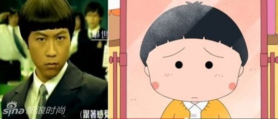 | Tạo hình của A Tín trong một MV của Ngũ Nguyệt Thiên rất giống với nhóc Maruko nổi tiếng. |