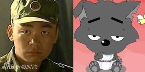 | Vương Bảo Cường có đôi mắt và lông mày giống với nhân vật Sói xám trong bộ phim hoạt hình Dê trắng và sói xám. |