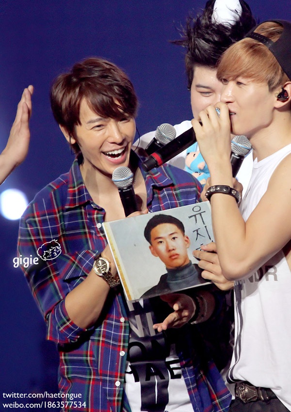 | Donghae hớn hở trước tấm hình khi bé của Eunhyuk. |