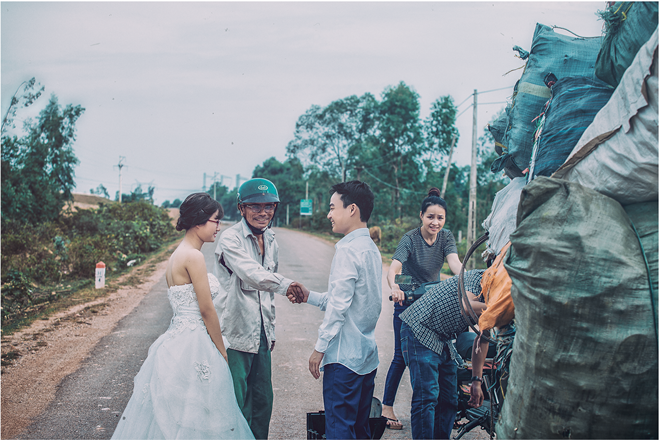 Chú rể Văn Chiến cho biết: “Chúng mình rất vui và bất ngờ khi biết bức ảnh được dân mạng chú ý. Trong khoảnh khắc đó, mình không quan tâm đến bộ đồ cưới, mà chỉ nghĩ đó là việc cần làm để giúp đỡ người đang gặp sự cố trên đường. Sau đó, bác chở hàng cám ơn chúng mình nhiều lắm nên mình hạnh phúc đến khó tả”.