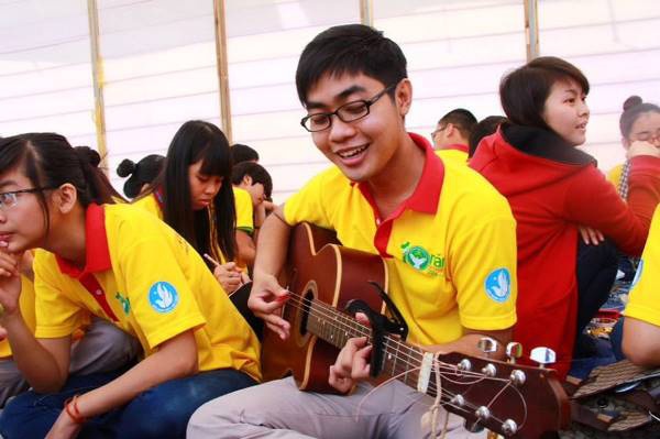 | Giây phút giải lao tràn ngập những lời ca, điệu đàn của sinh viên tình nguyện. |