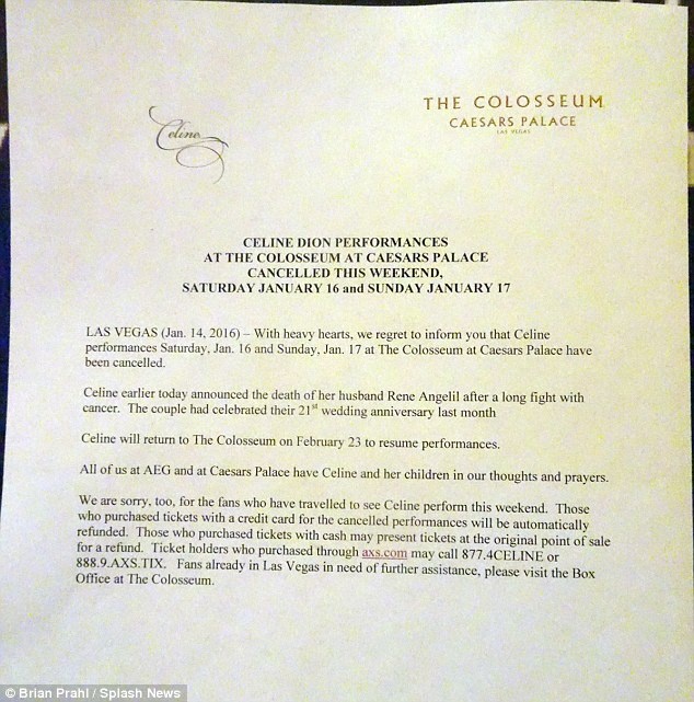 Đáng buồn khi 3 năm sau căn bệnh ung thư quay trở lại với Angélil. Một lần nữa Celine rời xa sân khấu để làm trọn vai trò của người vợ đảm đang. Ca sĩ Canada trở lại Las Vegas biểu diễn năm ngoái, sau khi chồng cô dù yếu đi nhiều nhưng kiên quyết không cho cô từ bỏ sự nghiệp ca hát. Ngày 14/1 vừa qua, René Angélil đã qua đời tại nhà riêng tại Las Vegas sau thời gian dài chiến đấu với bệnh ung thư. |