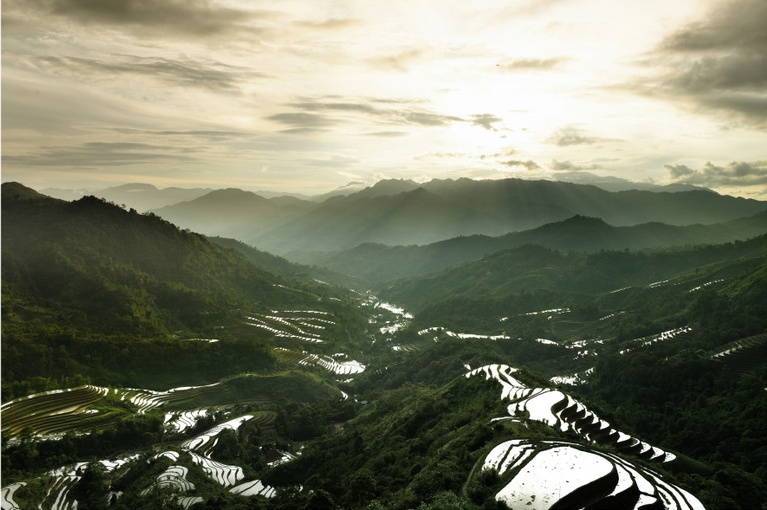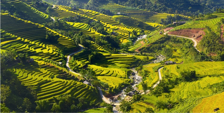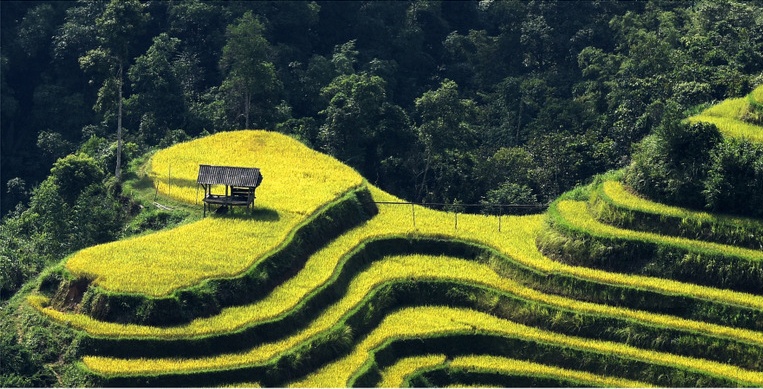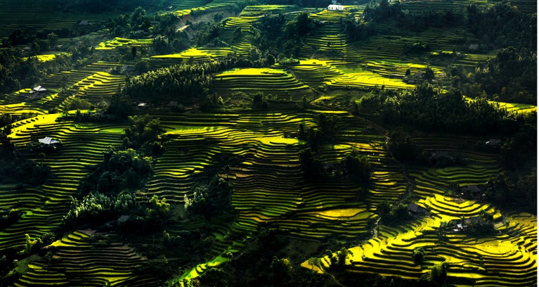 | Ruộng bậc thang ở Hoàng Su Phì có đặc trưng là rất cao và xen lẫn cánh rừng vàng. |