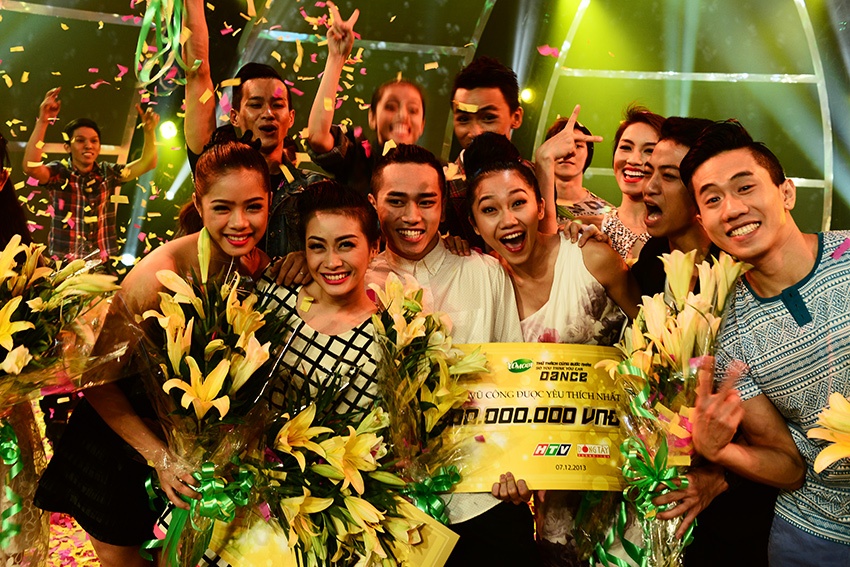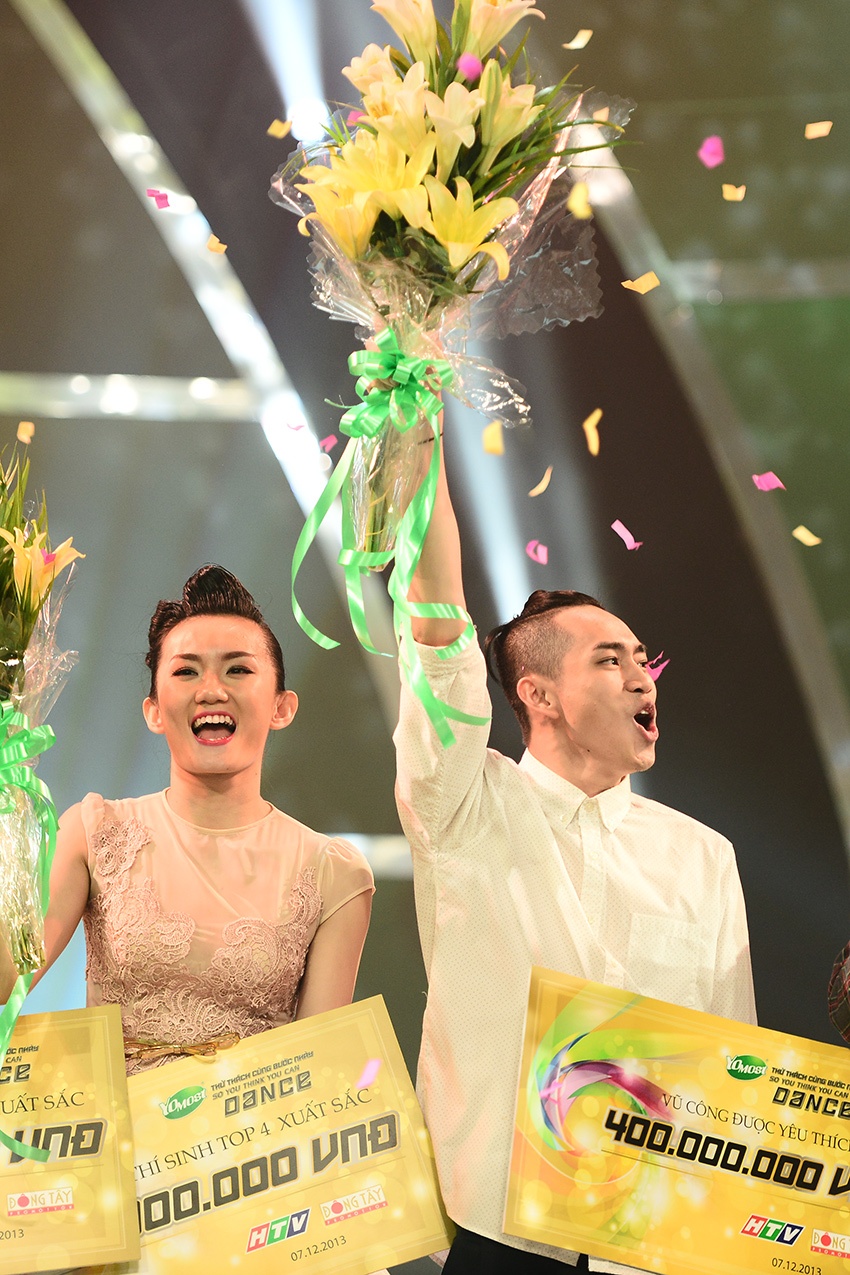 Anh và Mỹ An reo vui sung sướng khi nghe Trấn Thành công bố giải quán quân và á quân. |