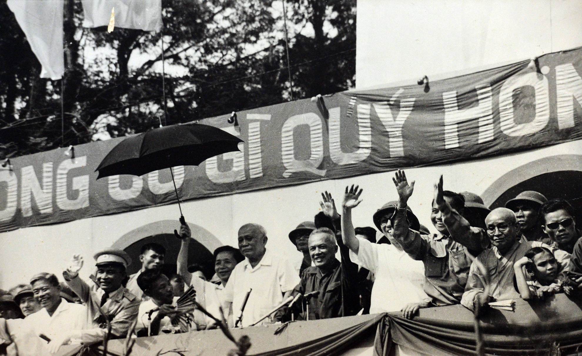 | Chủ tịch Tôn Đức Thắng trên lễ đài trong Lễ chào mừng chiến thắng ở Sài Gòn 15/5/1975. |