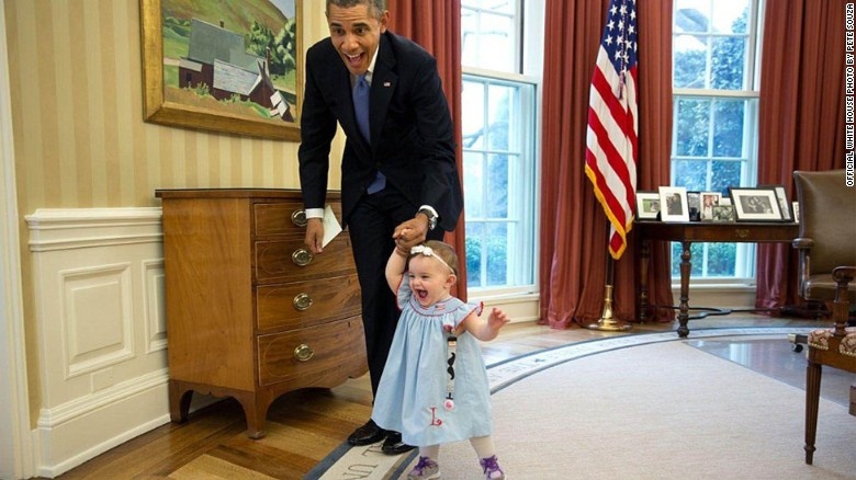 Tổng thống Mỹ chơi cùng bé Ella Harper Rhodes, con gái của Phó cố vấn an ninh quốc gia Ben Rhodes, tại phòng Bầu dục hôm 4/6. Ảnh: CNN