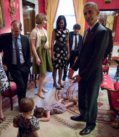Gương mặt của ông Obama khi bé Claudia Moser, con gái của nhà báo Laura Moser, lăn ra sàn để thể hiện sự giận dỗi trước mặt Tổng thống và Đệ nhất Phu nhân Michelle Obama. Ảnh: Twitter