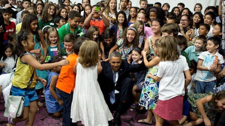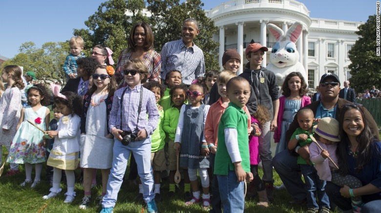 Obama và vợ chụp ảnh cùng các "mầm non tương lai" của Mỹ trước Nhà Trắng trong Lễ Phục sinh vào tháng 4/2014. Ảnh: CNN
