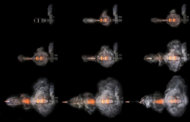 Đạn và khói thoát ra từ nòng khẩu súng trường Colt. Kuulapaa chụp liên tiếp 9 bức hình trong khoảng thời gian chưa tới một giây. Ảnh: CNA. |
