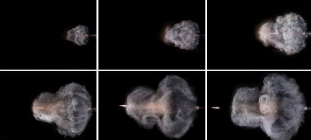 Đầu đạn kéo theo đám khói hình giọt nước khi lao ra khỏi nòng súng. Ảnh: CNA. |