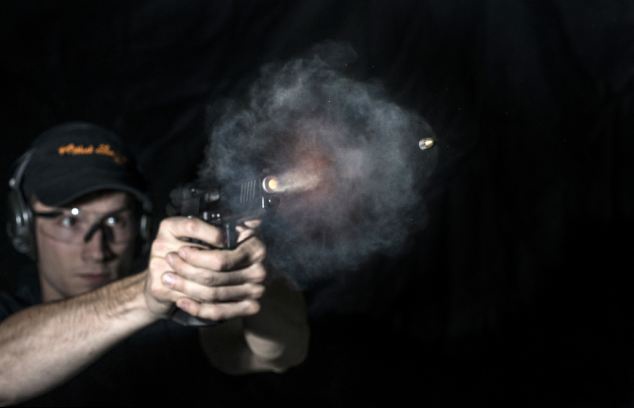 Tia lửa – hình thành do thuốc súng cháy – thoát ra khỏi nòng súng sau khi đẩy viên đạn bay ra ngoài. Ảnh: CNA. |