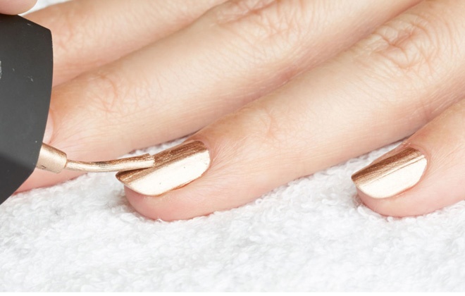 | Đây cũng là kiểu nail đơn giản, với các thao tác dễ làm và không cần bạn phải quá khéo tay. Để tự thực hiện nail ngũ sắc, bạn cần chuẩn bị 5 màu sơn gồm sơn ánh kim, đỏ, đen, xanh và tím (hoặc các màu sơn khác tùy sở thích của bạn). Đầu tiên là sơn phủ toàn bộ móng với lớp màu ánh kim. |