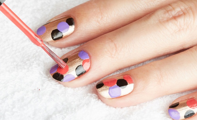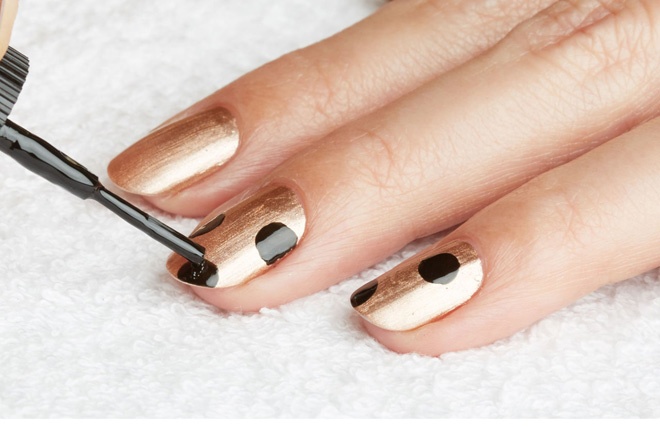| Sau khi sơn ánh kim khô, dùng đầu cọ sơn đen tạo chấm tròn nhỏ trên các móng. |