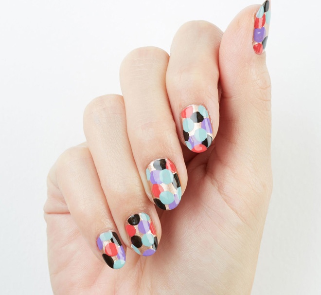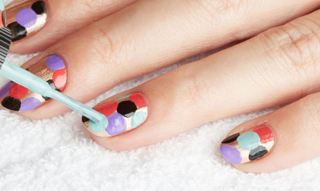 | Kết thúc kiểu nail ngũ sắc với những chấm sơn tròn màu xanh. |