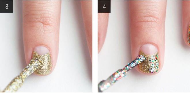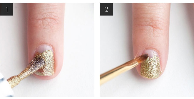 | Bắt tay vào việc bằng cách phết một lớp sơn bóng không màu lên toàn bộ móng. Để khô rồi phết thêm lớp sơn kim tuyến từ đầu cho đến gần cuối móng tay. |