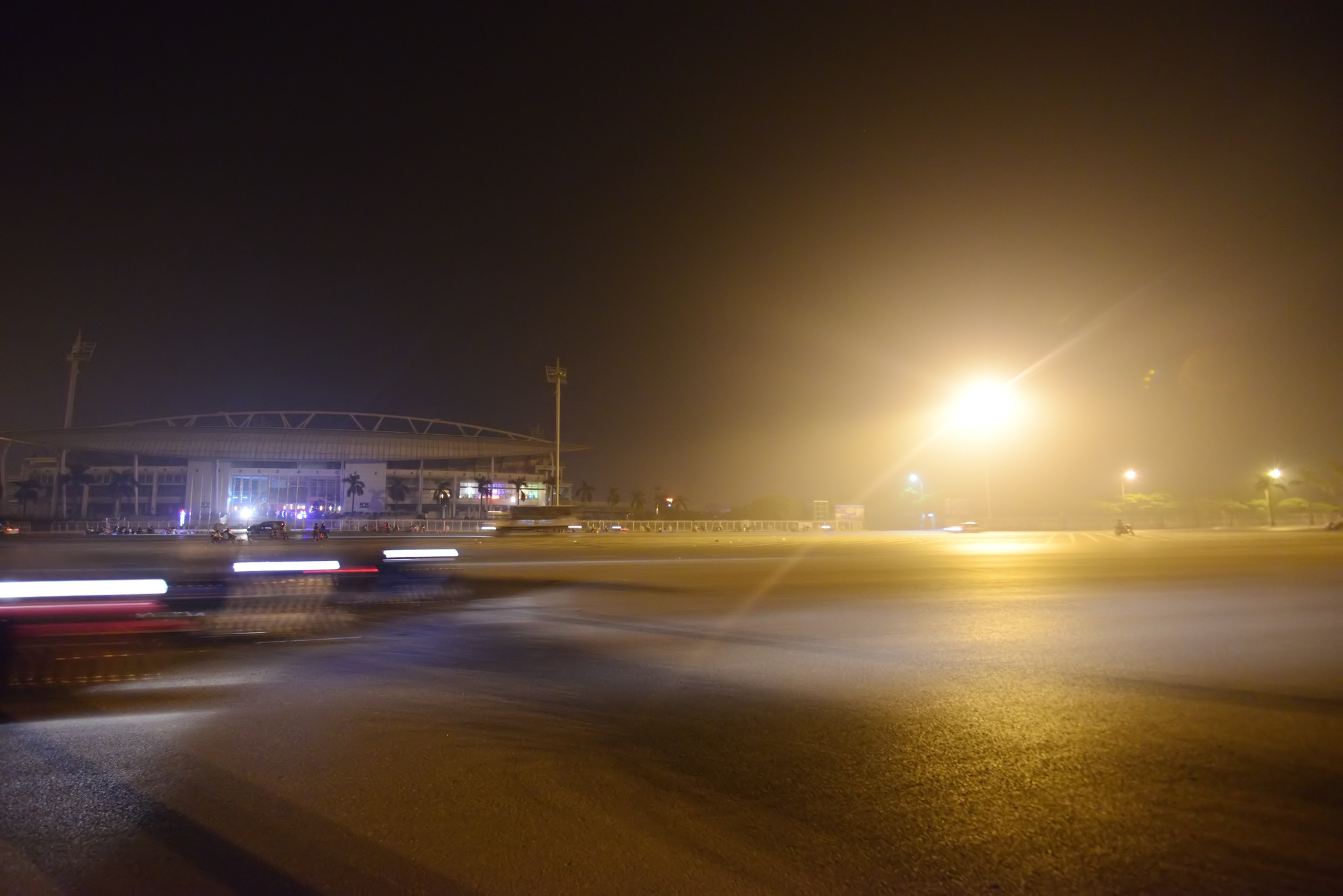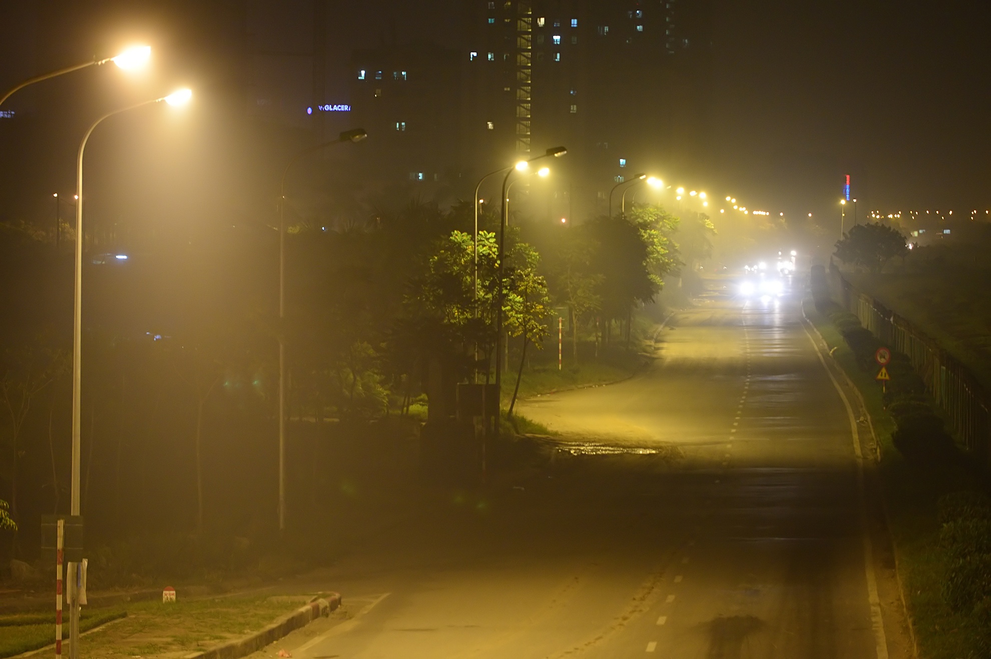 Đại lộ Thăng Long lúc 20h ngày 21/10. Nhiều phương tiện phải di chuyển chậm, bật đèn sương mù để đảm bảo an toàn.