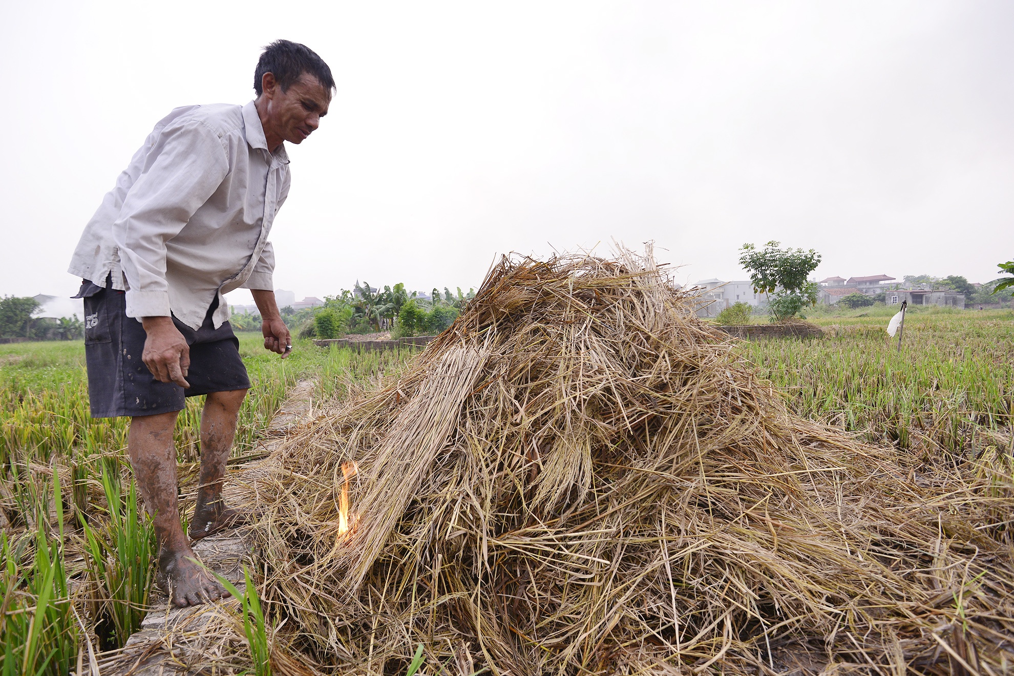 | Nông dân xã Song Phương, Hoài Đức đang gom rơm lại để đốt cho ruộng sạch sẽ. "Chúng tôi đốt rạ để ủ thay phân luôn", ông nói thêm. |