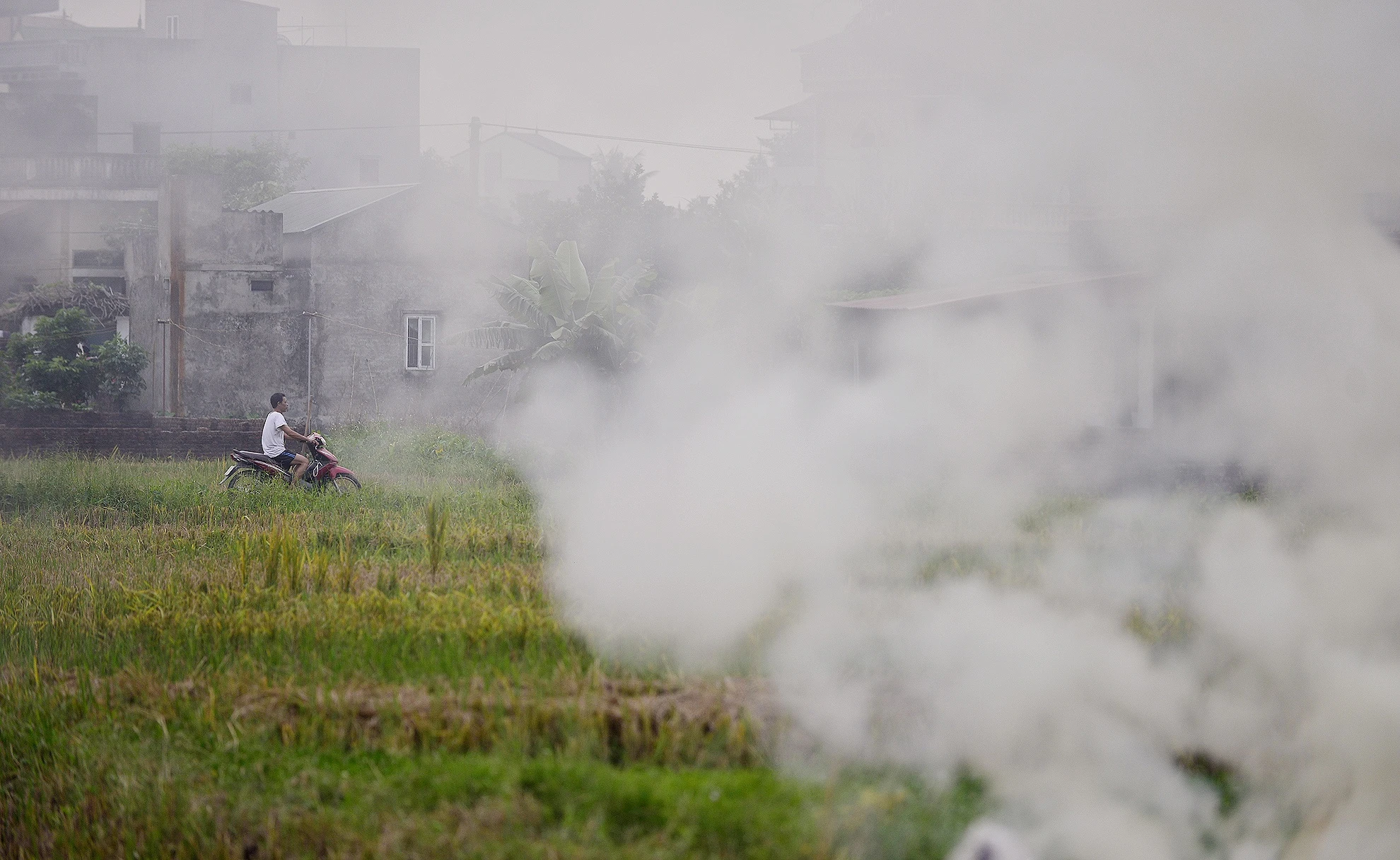 Khói mù thường xuất hiện trong khoảng tháng 9, 10 trùng với thời gian người dân thu hoạch lúa. Hình ảnh ghi lại tại huyện Đông Anh chiều 21/10.