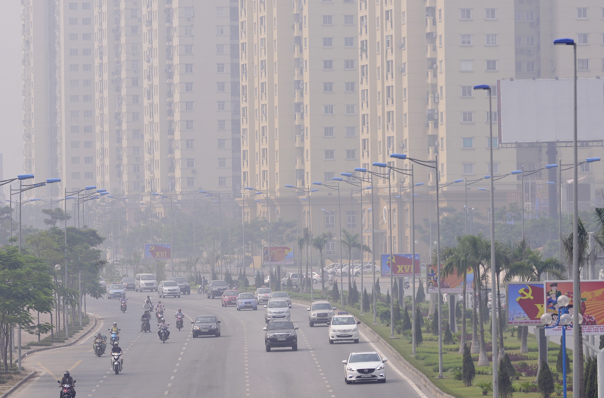 Khói khiến trục các đường chính của đại lộ Thăng Long được phủ màu trắng đục chiều 21/10.