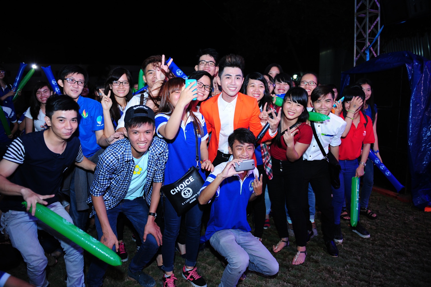 Nữ ca sĩ trẻ cười tươi rói trong vòng tay của các sinh viên tại chương trình Văn Hiến trường tôi.