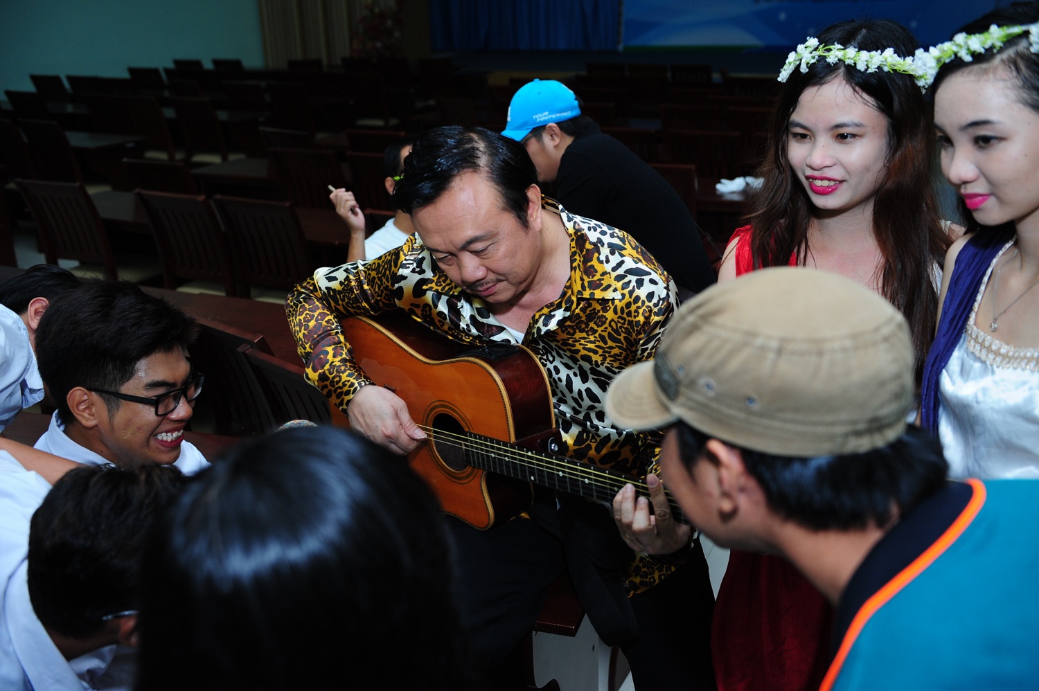 | Các bạn sinh viên vây quanh Chí Tài để thưởng thức khả năng chơi đàn của danh hài. |