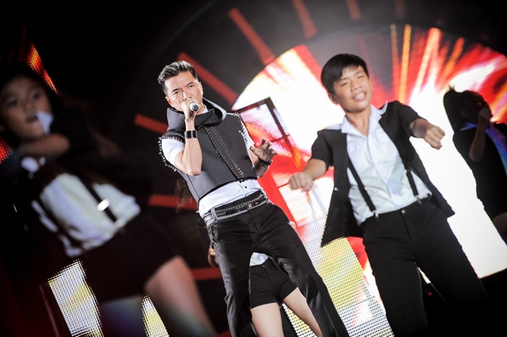 | Anh mang đến ca khúc sôi động Chuyện tình nàng trinh nữ tên Thy và Đó kìa, cùng sự đầu tư trang phục và dàn vũ công nhí. |