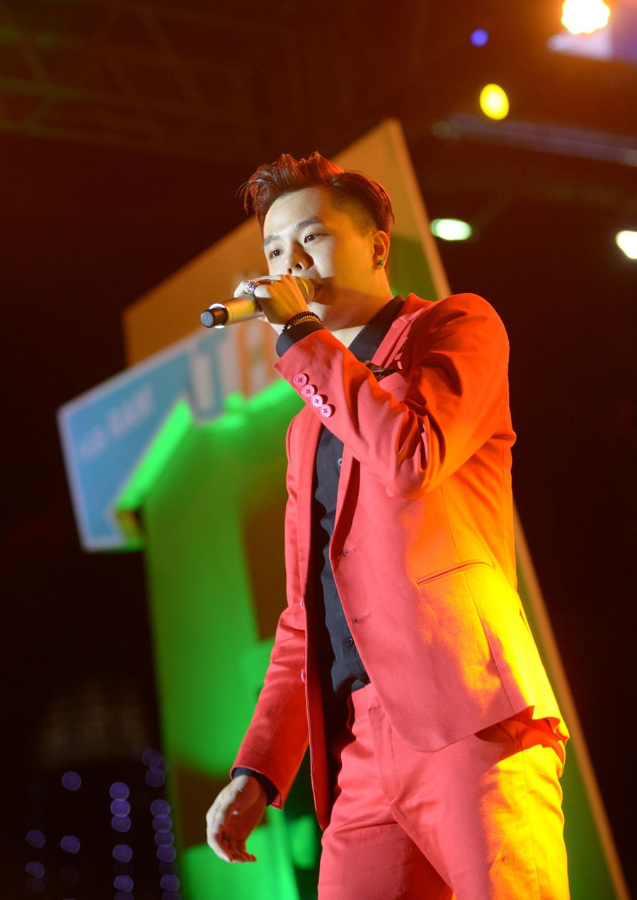 | Đêm nhạc còn có sự góp mặt của nam ca sĩ Trịnh Thăng Bình. Tác giả các bản hit Người ấy, Lời chưa nói... ăn vận sành điệu với bộ vest tông màu đỏ cảm nổi bật, tự tin thể hiện ca khúc Người yêu tuyệt vời. |