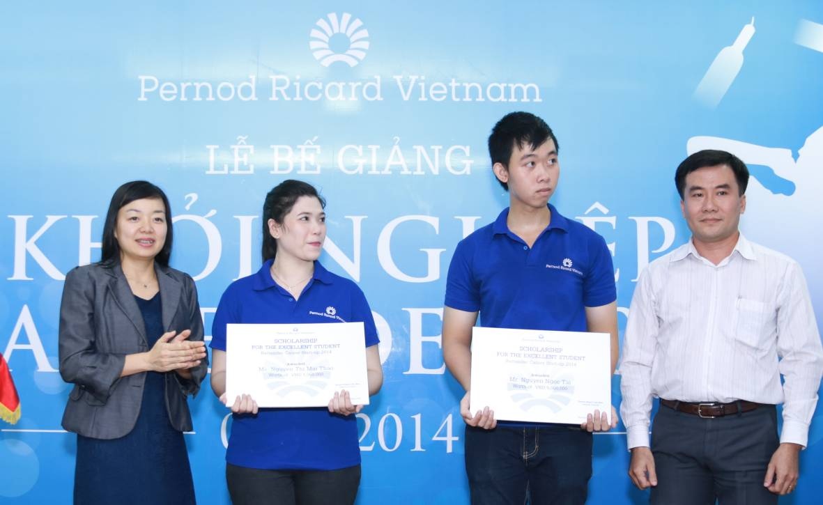 | Bà Nguyễn Thị Hoàng Anh - Tổng giám đốc Pernod Ricard Việt Nam, thầy Nguyễn Lê Đình Hải - Hiệu phó trường cao đẳng nghề Nguyễn Trường Tộ trao học bổng xuất sắc học viên tốt nghiệp khóa 2014. |