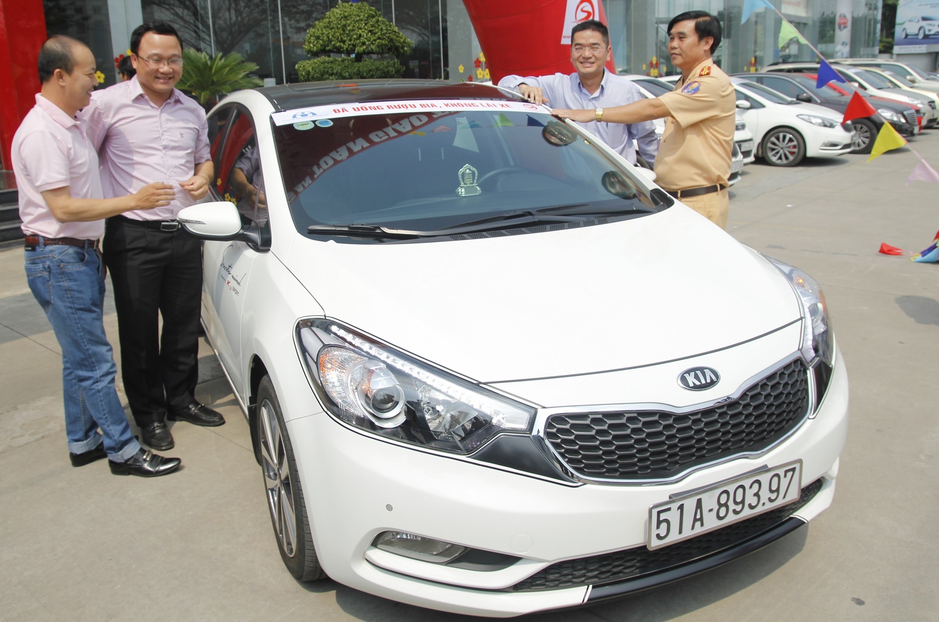 | Lãnh đạo Ủy ban An toàn Giao thông cùng đại diện ban quản trị diễn đàn Otosaigon dán băng cổ động trên xe. |