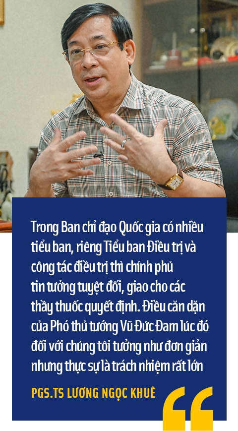 - Đầu tiên là chỉ đạo quyết liệt của chính phủ, niềm tin của các đồng chí lãnh đạo Đảng, Nhà nước. Tôi còn nhớ khi thành lập Trung tâm điều hành chỉ huy trực tuyến về Covid-19, trực tiếp Phó thủ tướng Vũ Đức Đam tới dự và có nói rằng trong Ban Chỉ đạo nhiều tiểu ban, riêng Tiểu ban Điều trị và công tác điều trị thì chính phủ tin tưởng tuyệt đối và giao cho các thầy thuốc quyết định. Chúng tôi được toàn quyền quyết định. Điều căn dặn của Phó thủ tướng Vũ Đức Đam lúc đó đối với chúng tôi tưởng như đơn giản nhưng thực sự là trách nhiệm rất lớn.