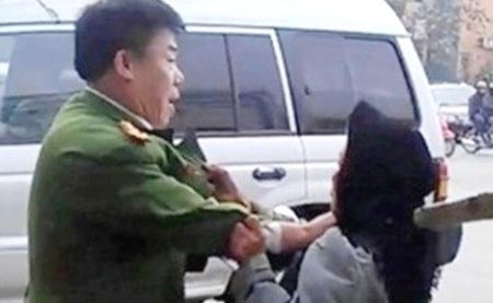 | Bà Chút túm cổ áo cán bộ công an Thanh Hóa (ảnh cắt từ clip). |