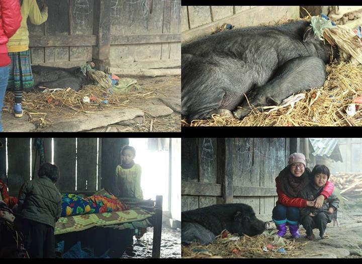 Trèo leo một lúc đến nhà A Páo, trước cửa nhà lầy lên bùn đất quện với rơm rạ, khiến tôi hình dung ra cảnh cái chuồng heo nhà bà tôi ở quê ngày trước. Quả thật, ngay cạnh cửa ra vào là cái ổ rơm cho một con lợn mẹ rất to cùng với một chú lợn con.