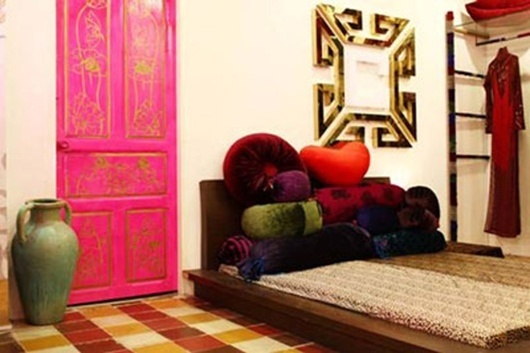 | Giường ngủ bố trí cạnh cánh cửa hồng lạ mắt. |