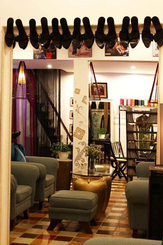 Cách trang trí khá "quái" vơi những đôi guốc treo cao.