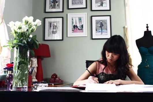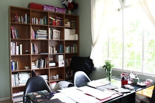 Phòng làm việc của Hoàng Ngân rất chuyên nghiệp, được bố trí cạnh cửa sổ thoáng đãng. Đặc biệt căn phòng có rất nhiều sách về thời trang.