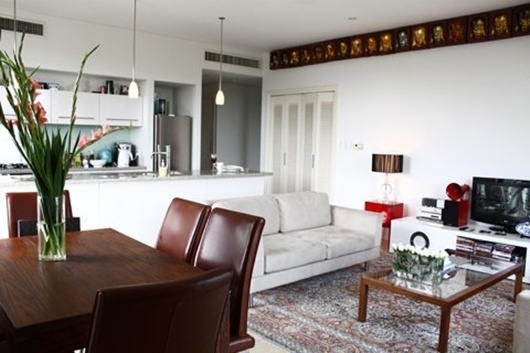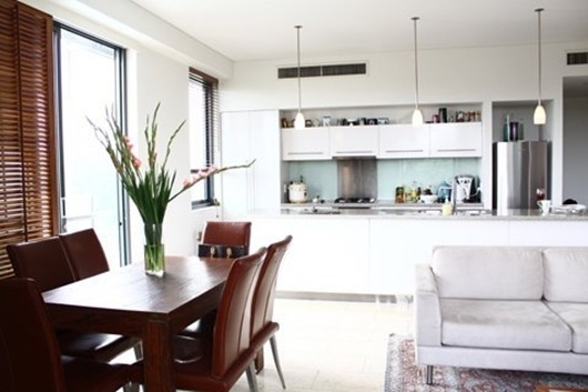 | Bếp, bàn ăn và phòng khách được bài trí trong cùng một không gian. |
