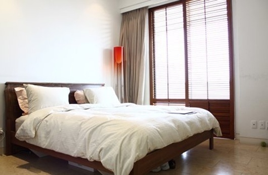 Phòng ngủ thể hiện rõ sự đơn giản mà tinh tế của nữ thiết kế trong việc bài trí nhà. Chị vẫn chọn tông màu trắng nhẹ nhàng cùng chiếc giường gỗ mộc mạc cho nơi nghỉ ngơi của mình.