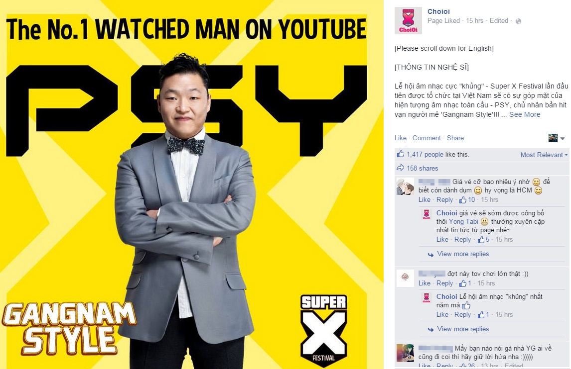 | Thông tin Psy sang Việt Nam được đăng tải trên trang mạng xã hội của công ty tổ chức biểu diễn trong nước. |