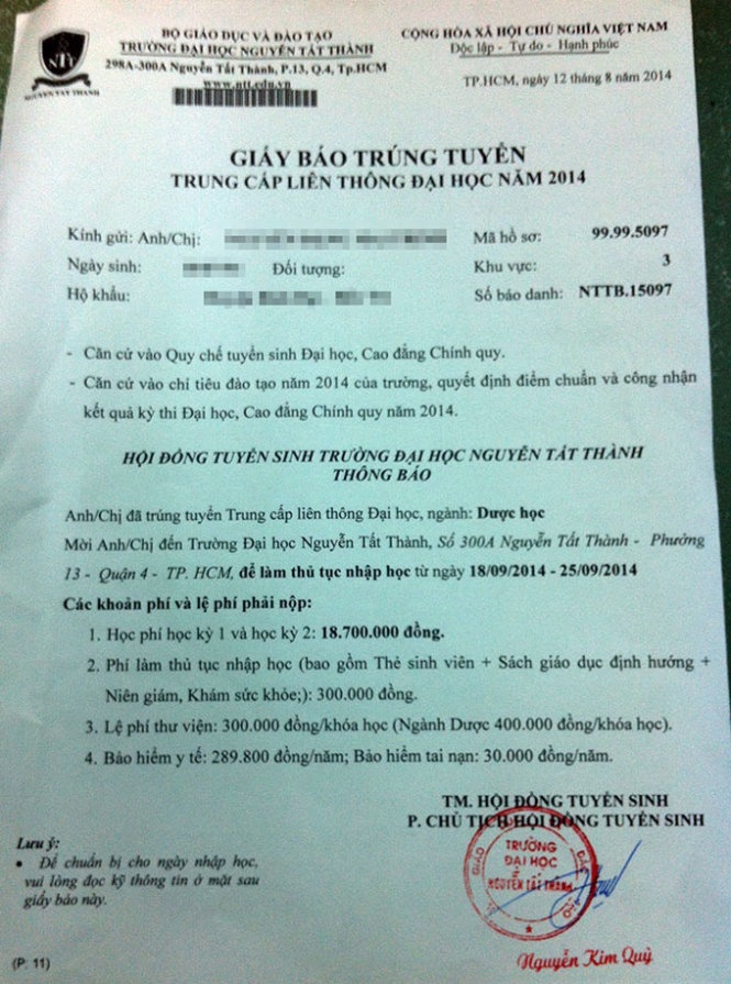 Sau khi nộp bằng tốt nghiệp TCCN và bảng điểm, cán bộ trung tâm tuyển sinh bảo chờ và 10 phút sau đưa cho chúng tôi giấy báo trúng tuyển ngay” - M.T. kể lại và cho chúng tôi xem bản chính giấy báo trúng tuyển trung cấp liên thông ĐH năm 2014 do hội đồng tuyển sinh Trường ĐH Nguyễn Tất Thành cấp ngày 12/8 có chữ ký của phó chủ tịch hội đồng tuyển sinh Nguyễn Kim Quỳ kèm theo dấu mộc đỏ của nhà trường.