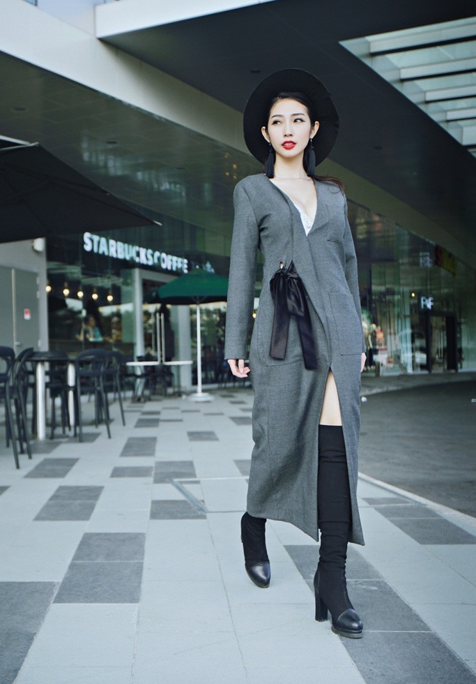 | Thiết kế tông xám phối tiệp sắc độ cùng phụ kiện tối màu, mũ fedora tinh nghịch. |