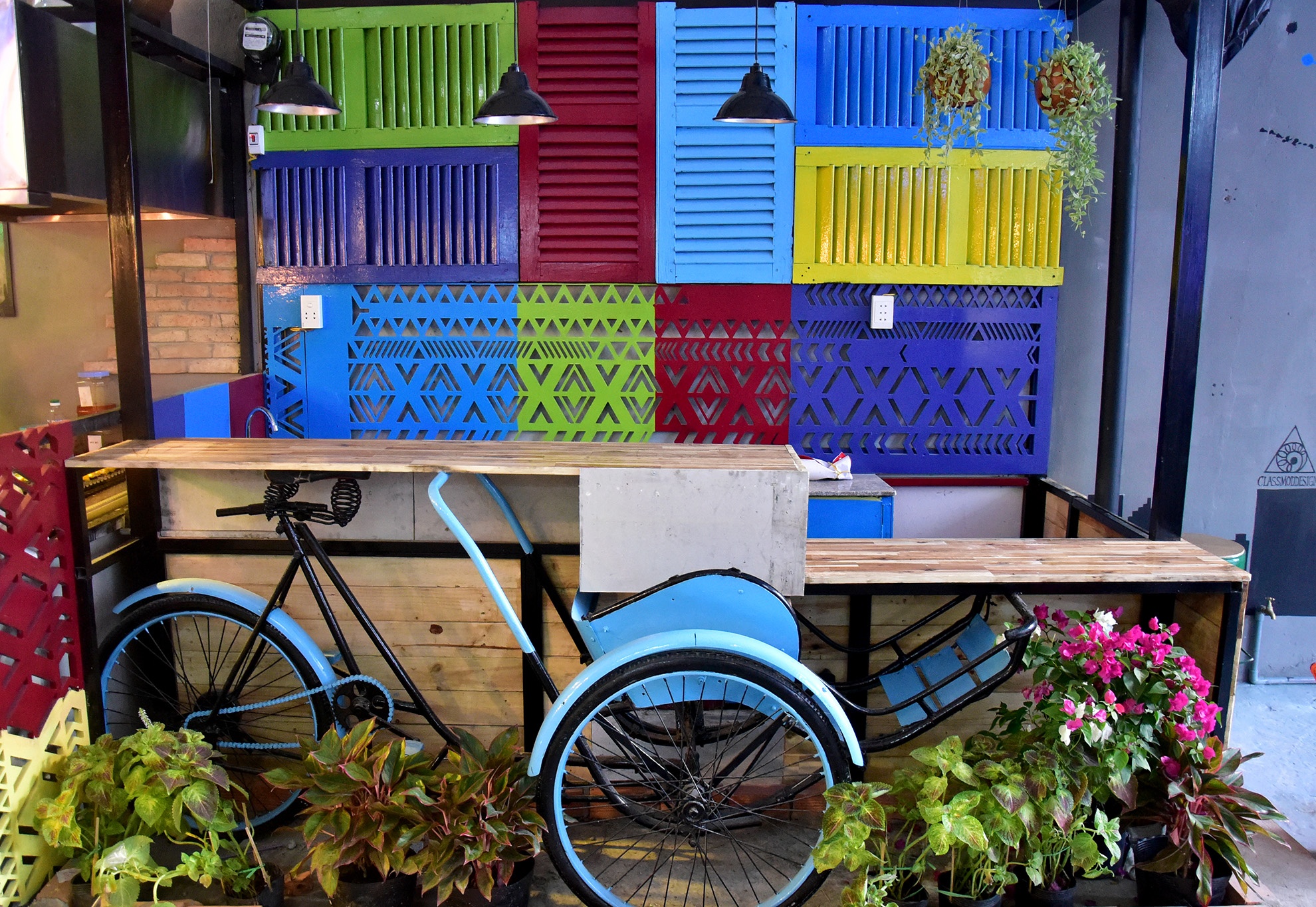 Sài Gòn với những hàng cây trăm tuổi, các gánh hàng rong, những dòng xe tấp nập, các mái nhà lợp ngói được đưa vào góc nhỏ mang tên Time Bistro.