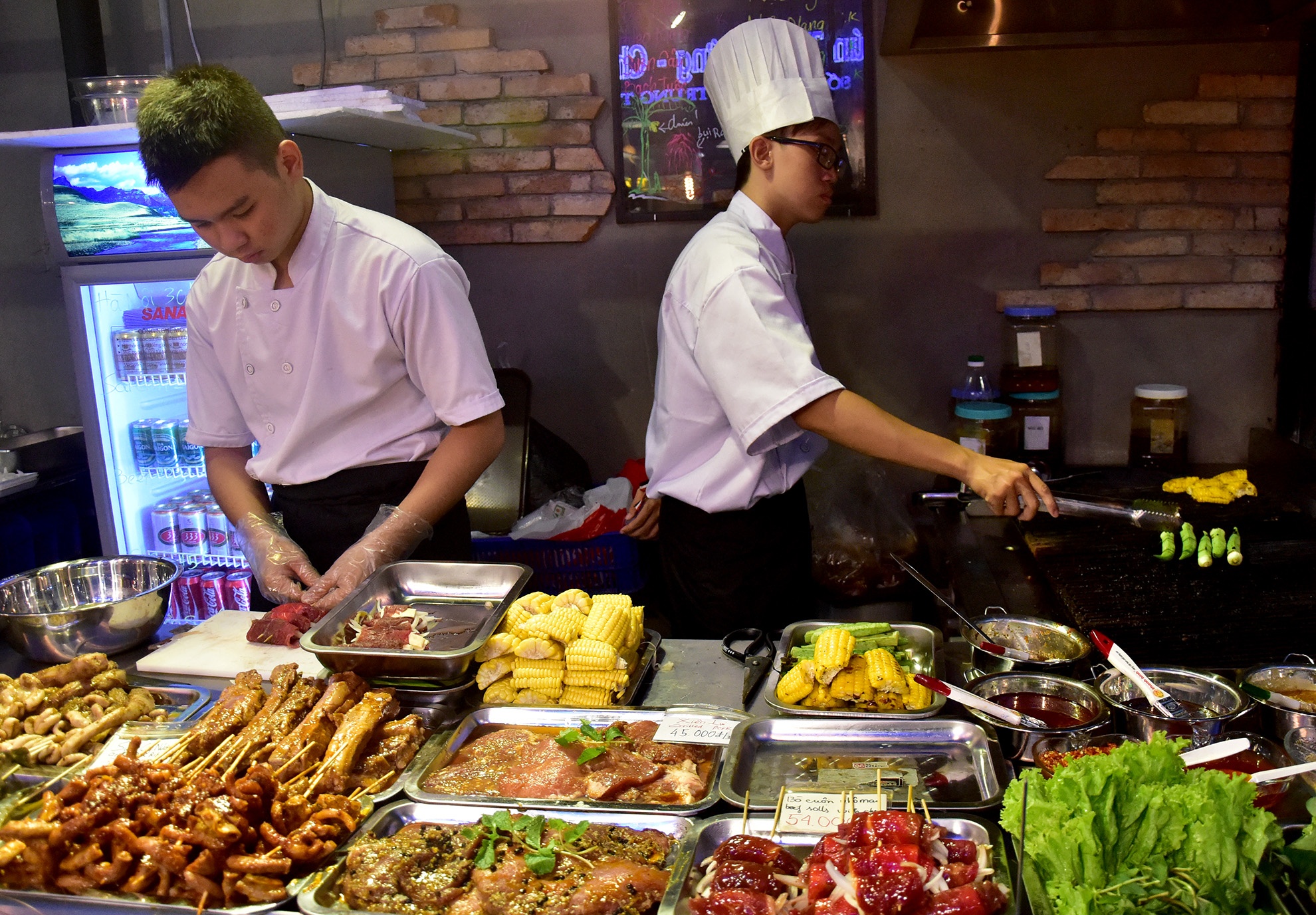 | Anh Nghĩa, quản lý quầy nướng Chú Tèo đánh giá, đây là mô hình kinh doanh mới lạ ở TP HCM mà chi nhánh của anh lần đầu tham gia. Mới khai trương vài ngày đã thu hút đông khách nước ngoài, đặc biệt vào buổi tối. "Hiện tại quầy tung ra 20 món nướng như lòng nướng, thịt đà điểu, cá sấu nướng, bánh hỏi thịt nướng", anh Nghĩa nói. |