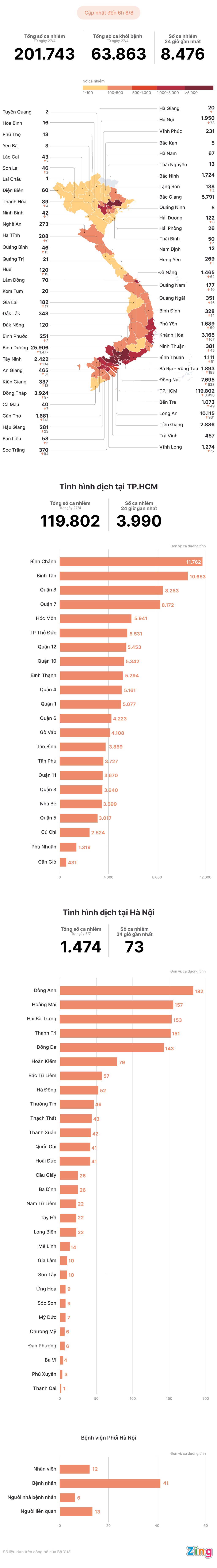 Tính từ 27/4 đến nay, Việt Nam có 201.743 ca mắc Covid-19. Đặc biệt, dịch tại TP.HCM và Hà Nội vẫn diễn biến phức tạp.